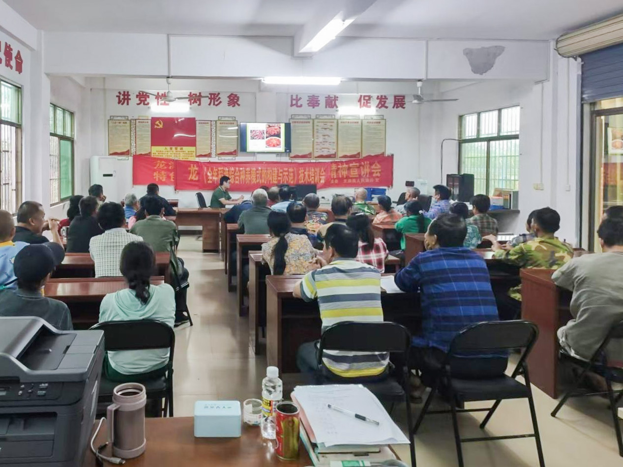 今年以来,在我所冼健安博士团队的技术支撑下,龙湖镇政府积极推进全年稻虾种养技术,已经建设完成示范基地100多亩。基地建成以来,有效提高了稻田的利用率,农民持续增收,定安县农业农村局经过实地考察后,认为全年稻渔模式值得全县推广,并组织开展此次培训。本次培训的旨在为当地种养殖户普及“稻-小龙虾综合种养模式”,传授养殖知识,鼓励种养殖户积极尝试,提高种养积极性。