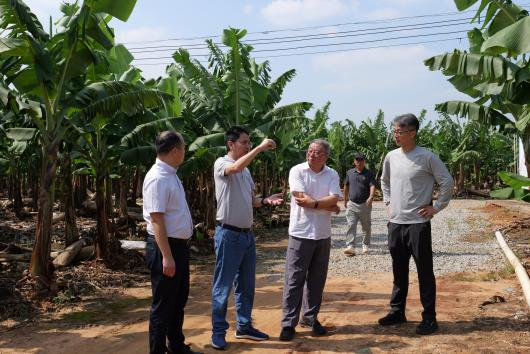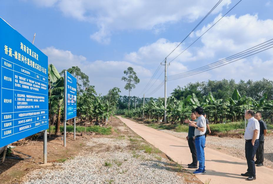 在儋州大成镇西庆农场三队专家们查看了国家香蕉产业技术体系和天然橡胶产业技术体系联合共建的“香蕉-橡胶间作栽培模式研发示范”效果,了解了该项目通过筛选适宜品种和明确最佳种植密度,研发养分管理、病害防控、土壤改良等优质高效生态栽培技术,对解决“香蕉无地种”和“橡胶收益低”两大产业难题有重大研究意义,是跨体系项目合作的一大亮点。