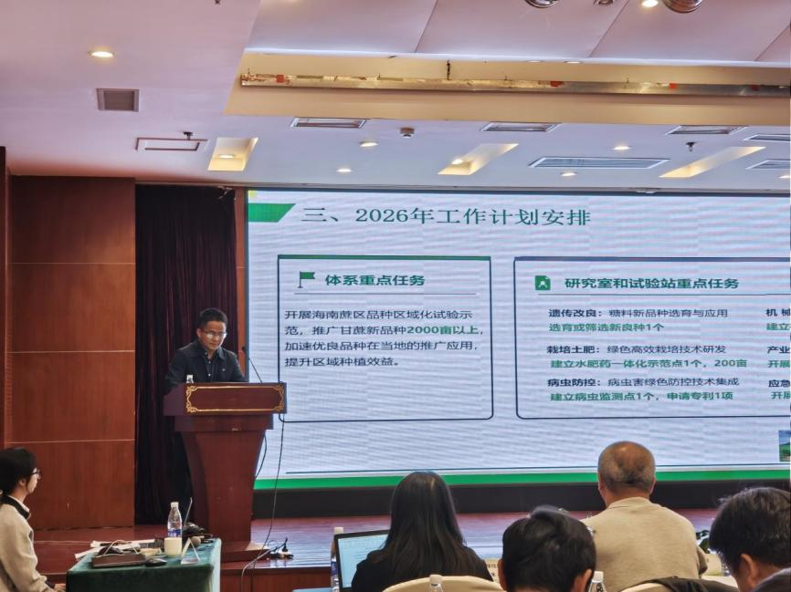 同时,蔡文伟副研究员代表“海南综合试验站”作“十五五”工作计划汇报。针对海南甘蔗产业发展实际,团队明确了六大核心攻关方向:重点开展宜机化甘蔗新品种选育及全程机械化示范、绿色高效栽培技术研发与应用、病虫害绿色防控技术集成示范、甘蔗机械化收获技术示范、供应链监测与风险预警以及应急服务与技术咨询等工作,全面提升海南甘蔗产业单产水平,实现经济与生态效益双提升。助力海南糖料产业高质量发展。