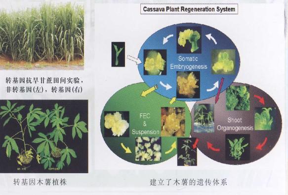 建立了成熟的甘蔗脱毒苗生产技术体系和病原检测体系,建立了甘蔗胚性愈伤组织→胚状体→完整植株的再生体系,建立了成熟的干燥遗传住哪话技术体系,已经培育了3个抗旱性能提高的转基因甘蔗株系并被批准进行环境释放试验。