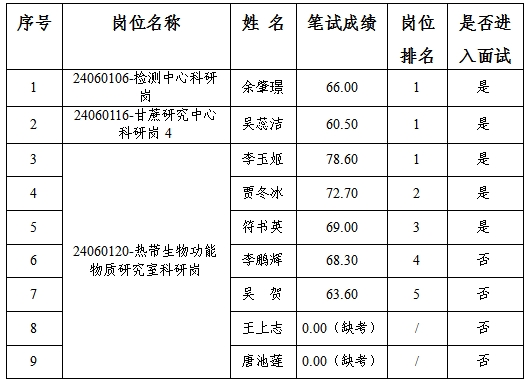 根据热科院生物所2024年第四批公开招聘工作人员工作安排,我单位已于2024年10月9日组织了线上笔试。根据所相关招聘文件要求,入围面试人选根据应聘笔试成绩从高到低,按照5人以下(含)取前3名、超过5人取前5名确定面试人选。现将笔试成绩及入围面试人员名单公告如下: