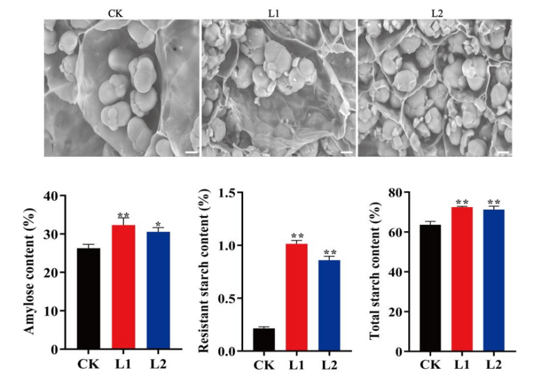 抗性淀粉难以被小肠吸收和消化,但能在大肠中发酵产生对人体有益的短链脂肪酸,是全球健康食品研究的热点之一。食用高抗性淀粉食物可预防和改善与能量代谢相关的慢性疾病,如心血管疾病、II型糖尿病。提高木薯抗性淀粉含量有助于改善以木薯为主粮的全球近10亿人口的营养和健康状况。