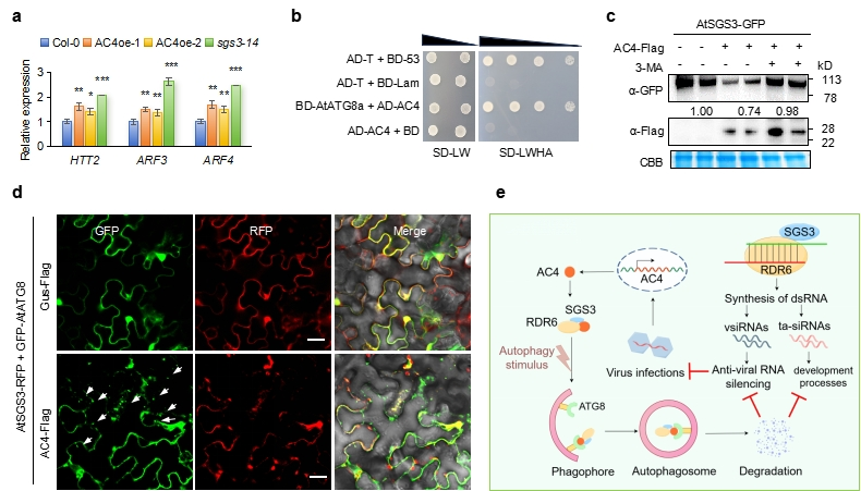研究发现,AC4与自噬标志蛋白ATG8a互作,并通过提高宿主自噬活性,选择性清除SGS3/RDR6复合体,抑制反式作用干扰小RNA的生物合成,揭示病毒“劫持”宿主自噬系统逃逸免疫的新策略。该研究首次将双生病毒VSR功能与宿主自噬通路联系起来,为病毒与宿主协同进化机制提供了新模式。研究成果不仅深化了对RNA沉默与自噬交叉调控机制的认识,还可为木薯抗花叶病品种设计提供靶点。